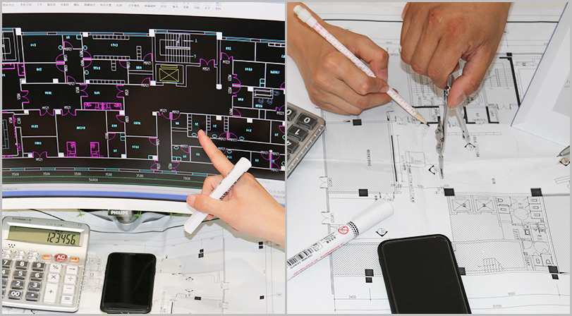 每承接一個工程,公司都會派出經驗豐富的技術團隊上門勘察、實地測量,提供工程設計方案。測量各個房間尺寸及造型情況,做好記錄,做到心中有數。